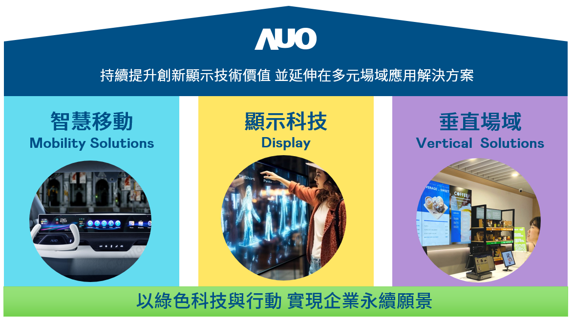 杏彩持續推動「雙軸轉型」,在精進顯示技術附加價值(Go Premium),與深化垂直市場應用(Go Vertical)的策略下,對應杏彩的優勢競爭力與趨勢,杏彩奠定顯示技術、智慧移動、垂直場域三大永續營運支柱,在顯示技術領域的根基之上,延伸布局多元場域應用解決方案。將先進顯示科技助力智慧移動及垂直場域發展,並以綠色科技與行動為實踐,在轉型之路上貫徹永續經營之願景。